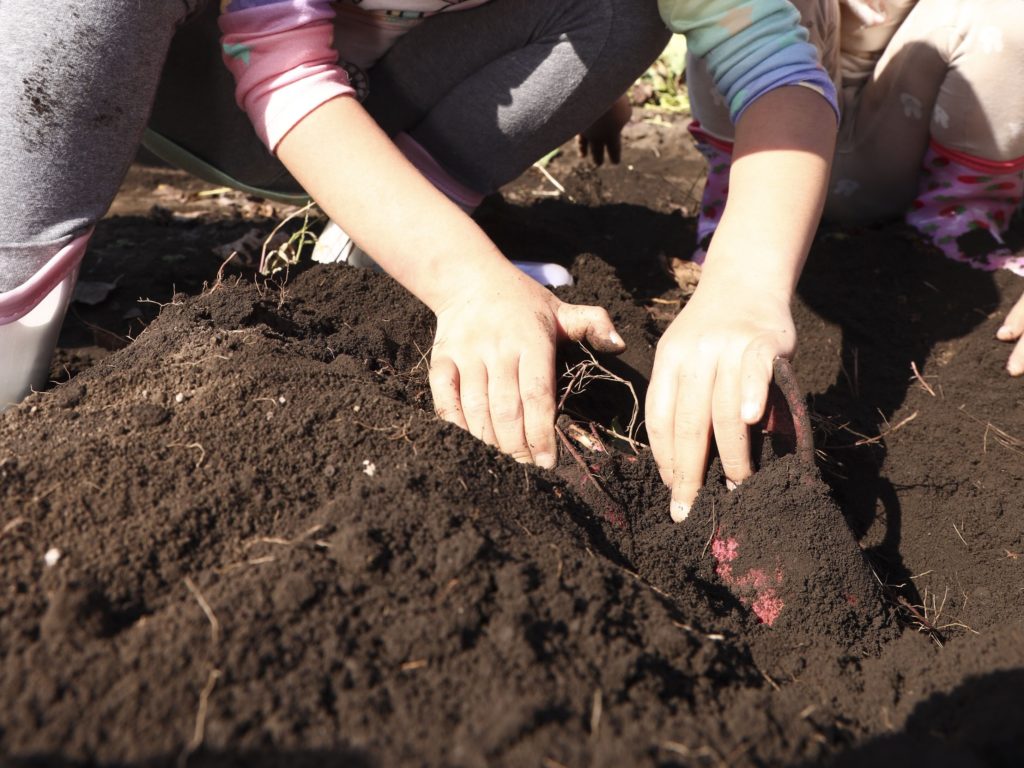 - 近隣の畑でサツマイモを育て泥だらけになり収穫します